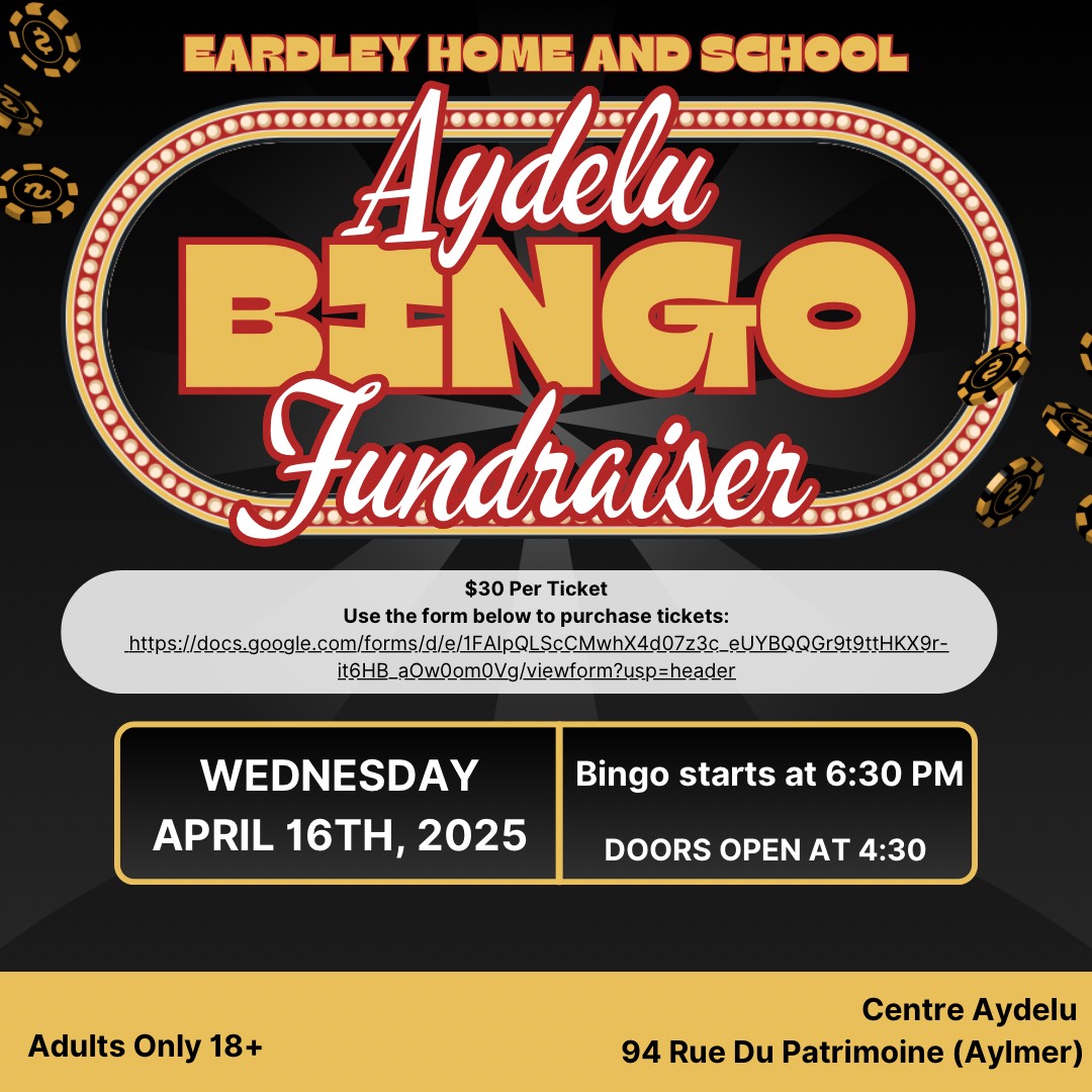 Bingo Night is April 16. Please see the attached flyer or link below to purchase tickets. https://docs.google.com/forms/d/e/1FAIpQLScCMwhX4d07z3c_eUYBQQGr9t9ttHKX9r-it6HB_aOw0om0Vg/viewform